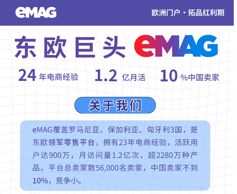 eMAG是罗马尼亚最大的在线零售平台,拥有24年电商经验,活跃用户达900万,月访问量1.2亿次,超2280万种产品。如今,平台业务已扩展至匈牙利和保加利亚,成为整个东欧地区电子商务的领导者,品牌知名度超90%。平台总卖家数56,000名卖家,中国卖家不到10%,竞争小。2024财年,eMAG集团业务收入超过了20亿欧元,订单量实现了2.6倍的增长,平台正处于快速增长拓品红利期。