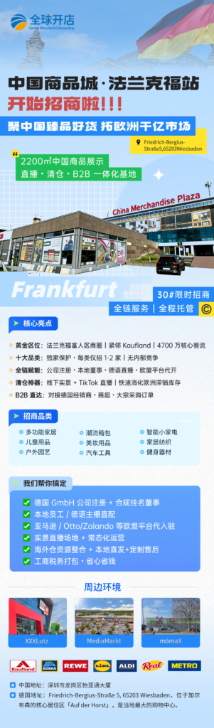 我们全球开店在德国拿下了法兰克福核心商圈的实体商城——这是行业内唯一能真正解决“本土化落地难、商超入驻门槛高”的标杆项目。
