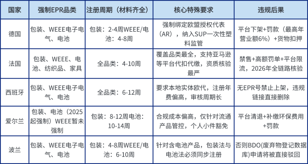 西班牙、爱尔兰这些国家就不一样了,它们属于费用和周期门槛更高的“困难户”。不仅注册费用高,周期还特别长,而且对回收凭证的审核极其严格。很多卖家习惯用一套资料去套所有国家,结果在西班牙那边碰了一鼻子灰。